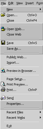 V nabídce File se vyskytují příkazy, které se týkají jednak souborů, jednak webů.